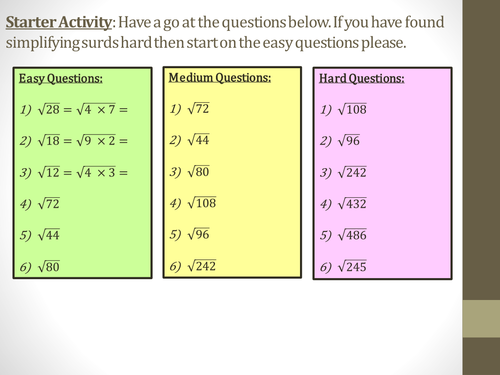 All surds need to be simplified first. Ready-to-use mathematics resources for Key Stage 3 Key Stage 4 and GCSE maths classes. Containing surds gives only fractions or whole numbers.